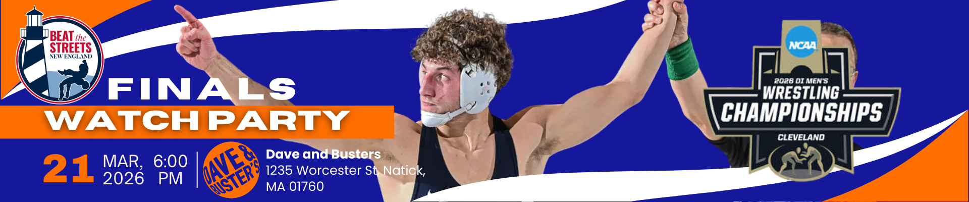 Join us for the NCAA Division I Wrestling Championship Finals Watch Party at Dave & Buster’s Natick as we bring together athletes, alumni, families, coaches, and fans for an electric night celebrating the sport we love.
